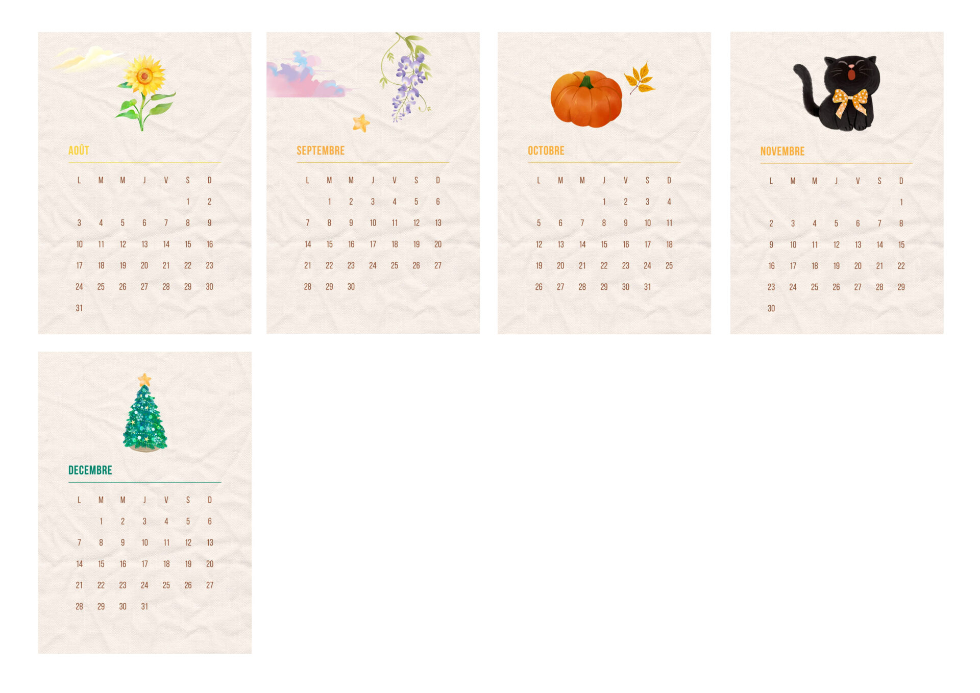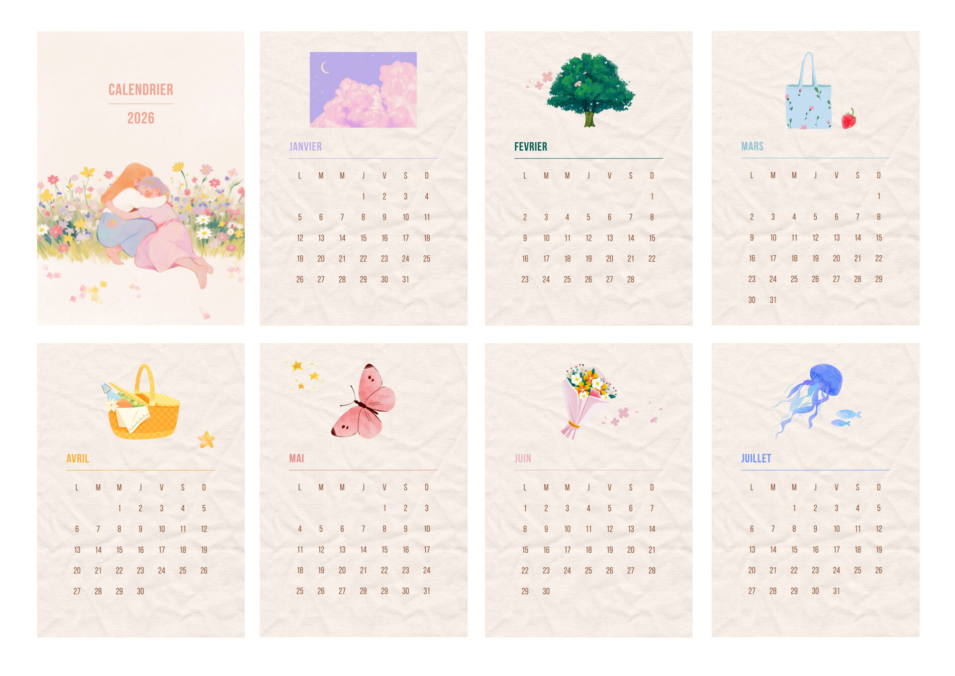 Retrouvez ici les fichiers pour imprimer et créer votre calendrier 2026. J’ai utilisé du papier 160g pour le faire. Hormis ce papier un peu épais, il suffit d’une paire de ciseaux et d’un petit chevalet ou d’une jolie pince pour obtenir le calendrier. Pour un résultat plus rapide il est aussi possible d’utiliser un massicot et une perforatrice coins arrondis. Comme souvent, j’ai créé ces fichiers sur Canva.